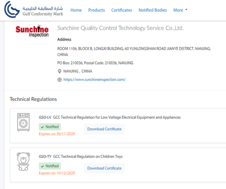 Sunchine Inspection has now been authorized in two key regulatory areas—Low-Voltage Electrical Equipment (LVE) and Toys—to provide official GCC Type Examination conformity certification services. GCC certification is a mandatory market access requirement for products entering all Gulf member states.
